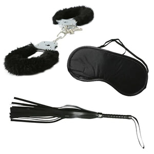 - Contents: 1 pair of black furry metal handcuffs, 1 black satin blindfold, and 1 gentle black whip (40 cm).